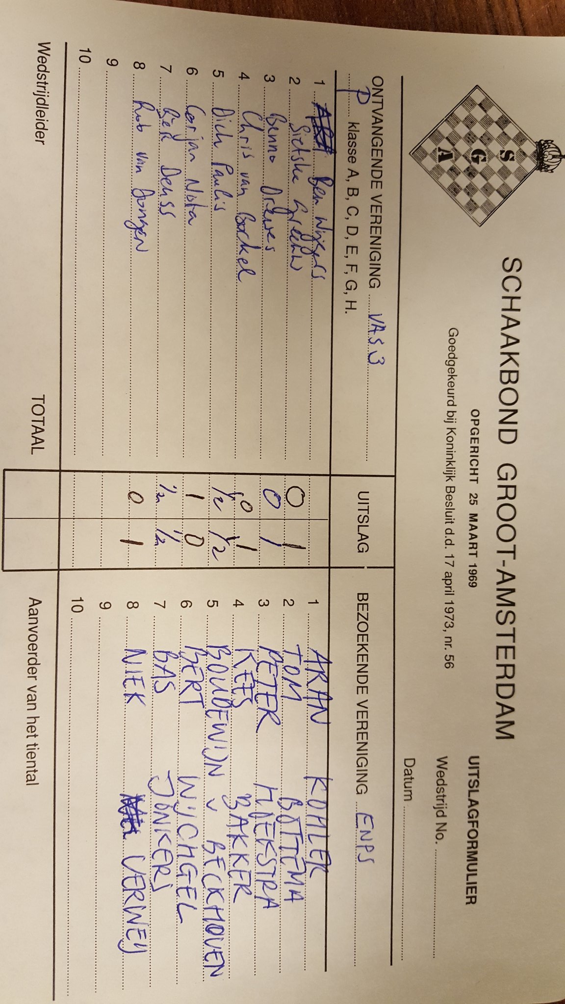 We hebben 5½-2½ gewonnen! Hele punten waren er voor Tom, Peter, Kees en Niek, halve voor Aran, Boudewijn en Bas. Helaas bleef Bert met lege handen achter, nadat hij een mooie en kansrijke partij had gespeeld.