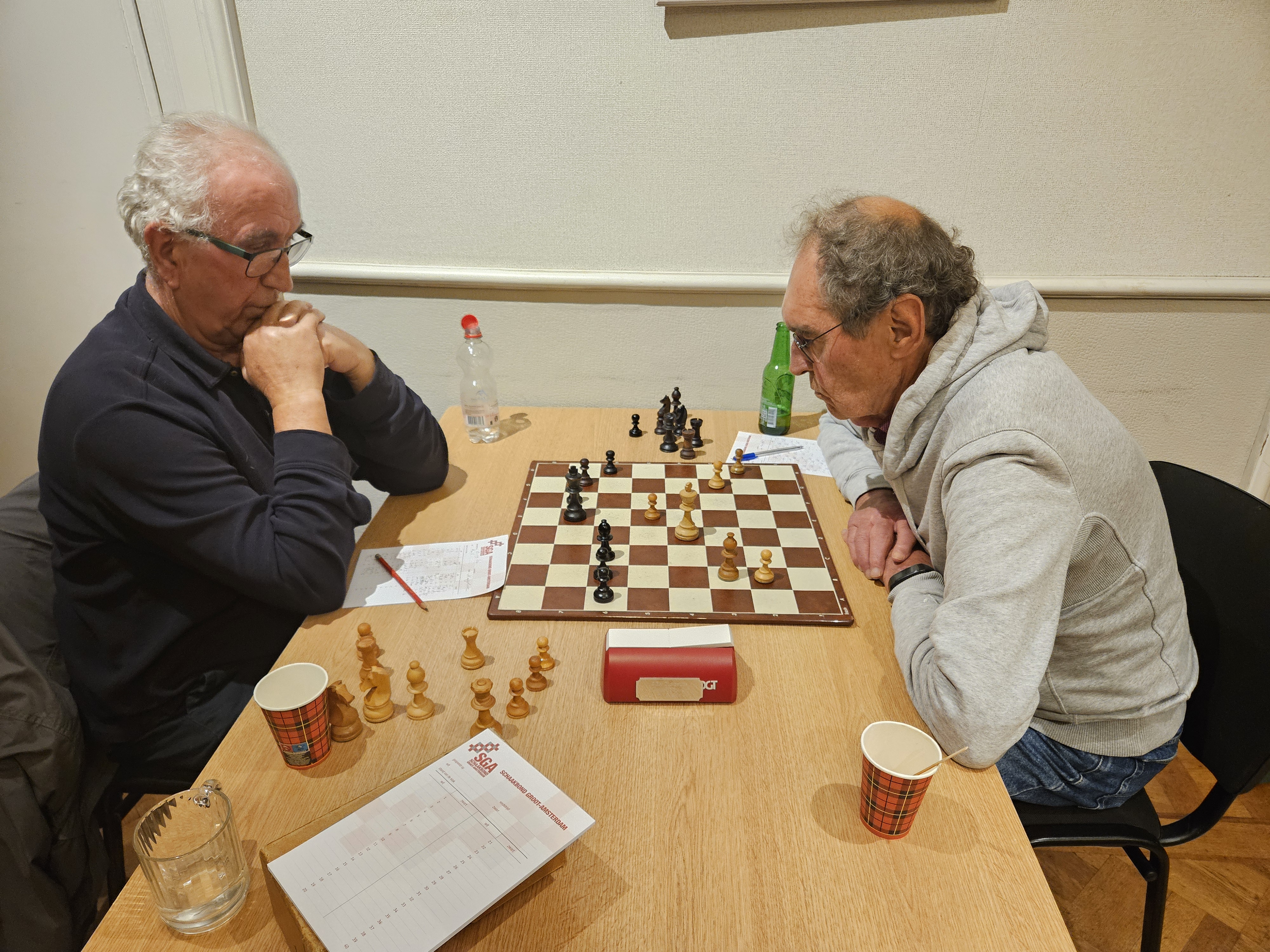 Victor – Boudewijn 0-1 Opening weet ik niet, vast wel een SOS'je van Boudewijn ;) De stelling was lang in evenwicht. Eindspel met een paard voor Victor tegen een loper voor Boudewijn. Pionnen aan beide vleugels 3+3 vs 3+3. Moet remise zijn maar Victor blundert. Hoe weet ik niet, misschien kon Boudewijn zijn a pion promoveren?